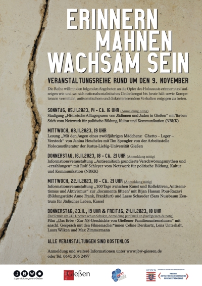 Die Veranstaltung ist Teil der Reihe „Erinnern, mahnen, wachsam sein“ rund um den 9. November, die jährlich von dem Jugendbildungswerk Gießen, dem Kulturamt Gießen und der DEXT-Fachstelle der Universitätsstadt Gießen organisiert wird. Gefördert wird die Veranstaltungsreihe vom Hessischen Informations- und Kompetenzzentrum gegen Extremismus im Rahmen des Landesprogramms „Hessen aktiv für Demokratie und gegen Extremismus“. Mit ihren vielfältigen Angeboten will die Reihe an die Opfer des Nationalsozialismus erinnern und aufzeigen, wie und wo sich nationalsozialistisches Gedankengut bis heute fortwirkt sowie Kompetenzen vermitteln, die es braucht, um antisemitischem und diskriminierendem Verhalten entgegenzutreten. Alle Veranstaltungen sind kostenfrei, in einigen Fällen ist jedoch eine Anmeldung erforderlich unter www.jbw@giessen.de. Nähere Informationen zu den Veranstaltungen der Reihe finden Sie hier.